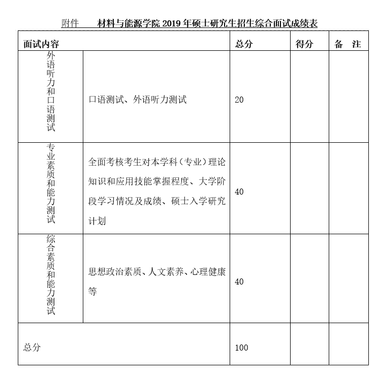 (2)综合面试:每位考生不少于10分钟,满分100分。考生准备PPT介绍本科专业、科研经历、研究生学习及科研发展规划等。导师组通过提问重点考查考生的思想政治素质、基本素养、学术能力、学术志趣、研究潜力、学术研究计划等。具体分值分布见附件《必一运动官网2019年硕士研究生招生综合面试评分表》。