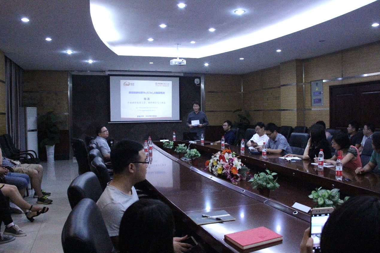 陈涛教授作了题为“新型硫硒化锑Sb2(S,Se)3太阳能电池”的学术报告。首先,陈教授介绍了太阳能电池的发展历程及其对新型硫硒化锑太阳能电池的研究。硫硒化锑(Sb2(S,Se)3)是一种新型太阳能电池材料,其带隙可调,且吸光系数高;而且该材料对水、氧较为稳定,所含元素在自然界储量丰富且环境友好。综合以上特点,硫硒化锑非常适合做太阳能电池的光吸收材料。接着,陈教授详细介绍了其课题组在新型硫硒化锑太阳能电池方面的相关工作,主要包括构建平面型结构的光电转换器件、建立了具有梯度带隙的Sb2S3/Sb2(S,Se)3光活性层以及通过Zn掺杂提高光电转换效率。最后,陈教授指出该类型的电池具有良好的稳定性,具备实际应用的前景。
