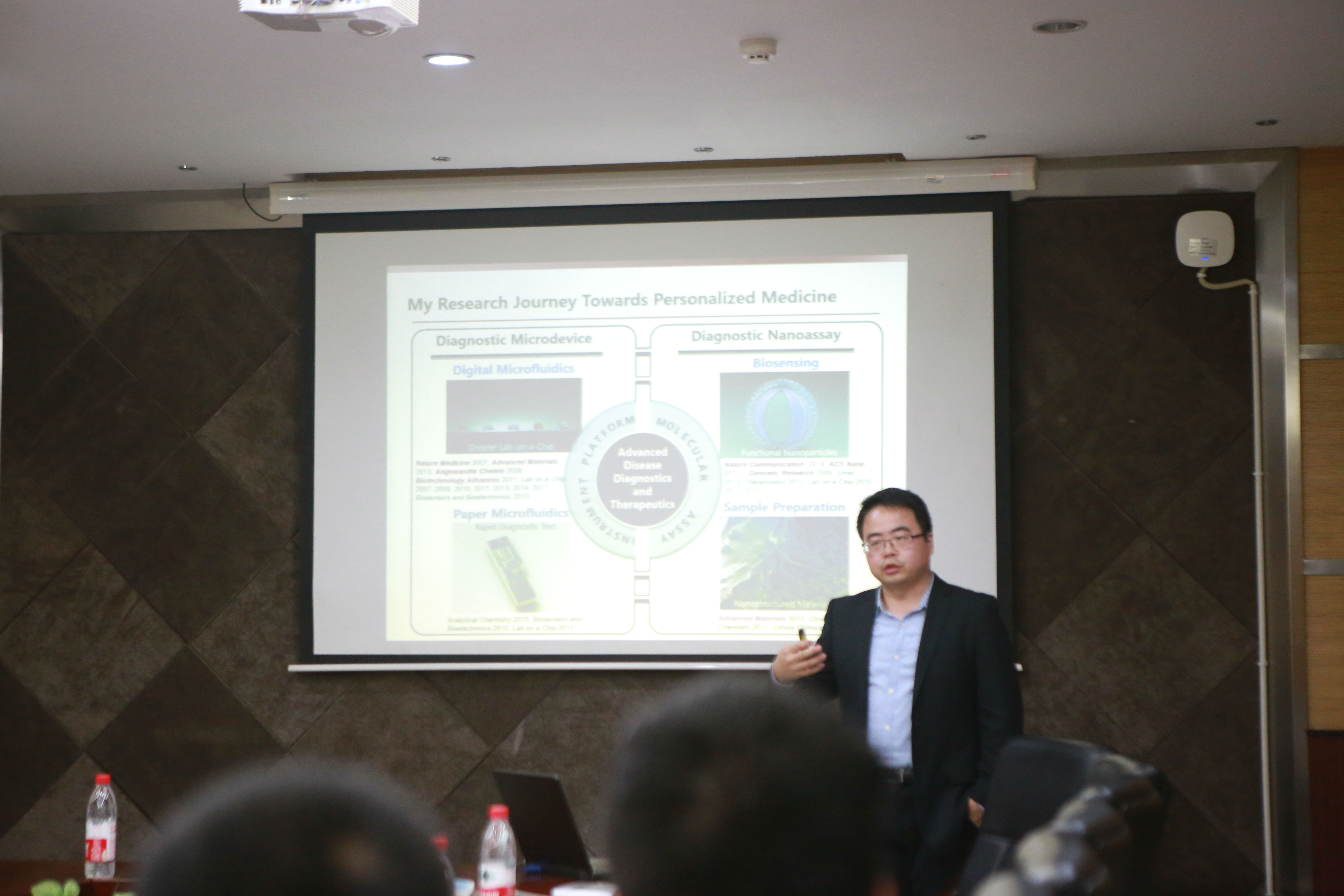 报告开始,康跃军教授首先对张翼教授的科研履历和研究内容做了简要的介绍。随后,张翼教授就他的第一个实验工作向在场师生做了相关报告,该工作讨论了具有新型表面特征的磁性数字微流体技术,这些技术能够实现全方位的液滴操作,并大大延伸其在护理点分子诊断和抗微生物药物敏感性方面的适用性。介绍完第一个工作后,张翼教授继续给大家介绍他的第二个工作,即利用二氧化硅基分级纳米结构材料在纯化高分子量DNA用于第三代单分子测序中的应用。张教授为现场师生奉献了极为精彩的学术报告,并赢得了师生们的阵阵掌声。