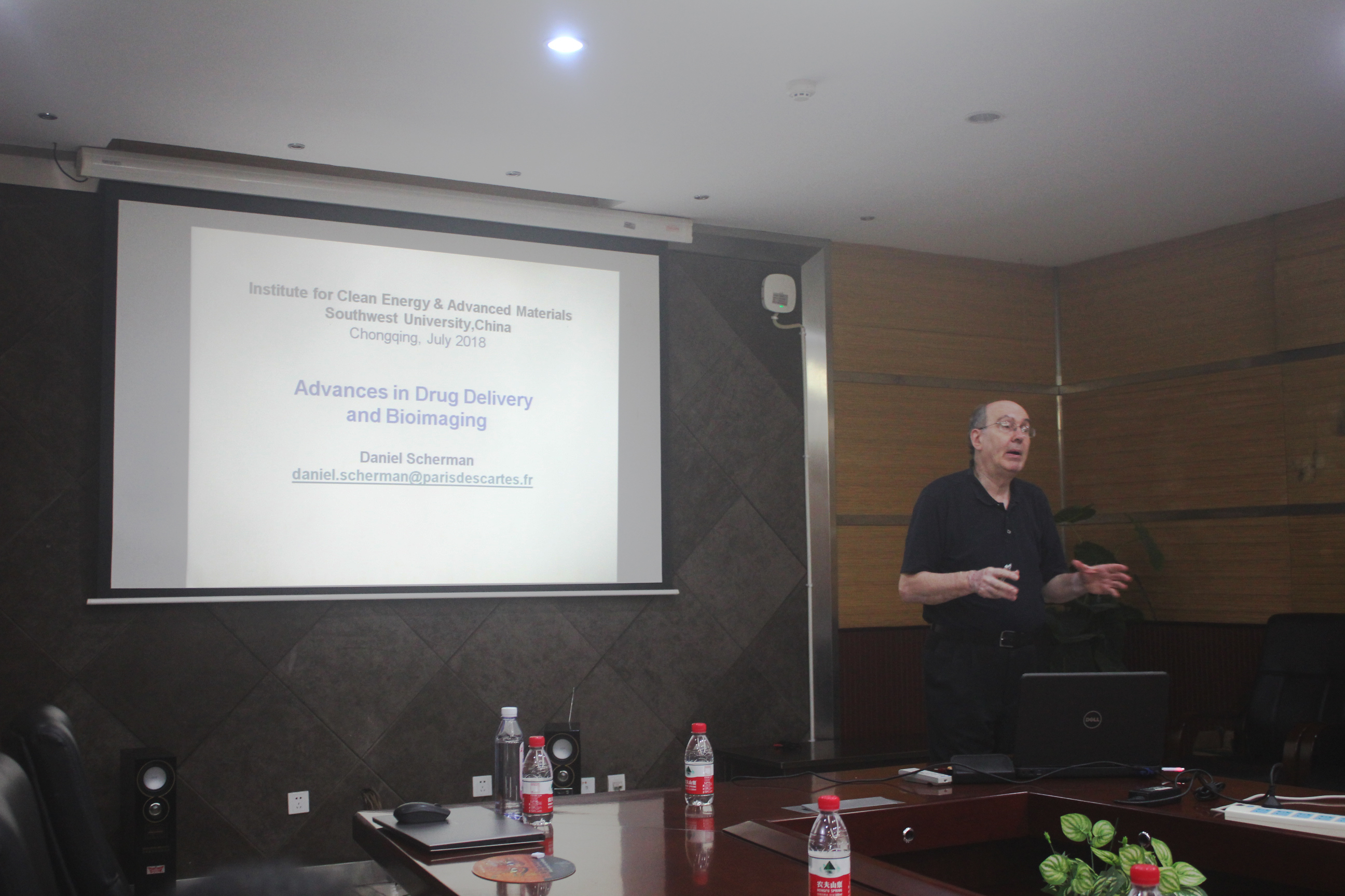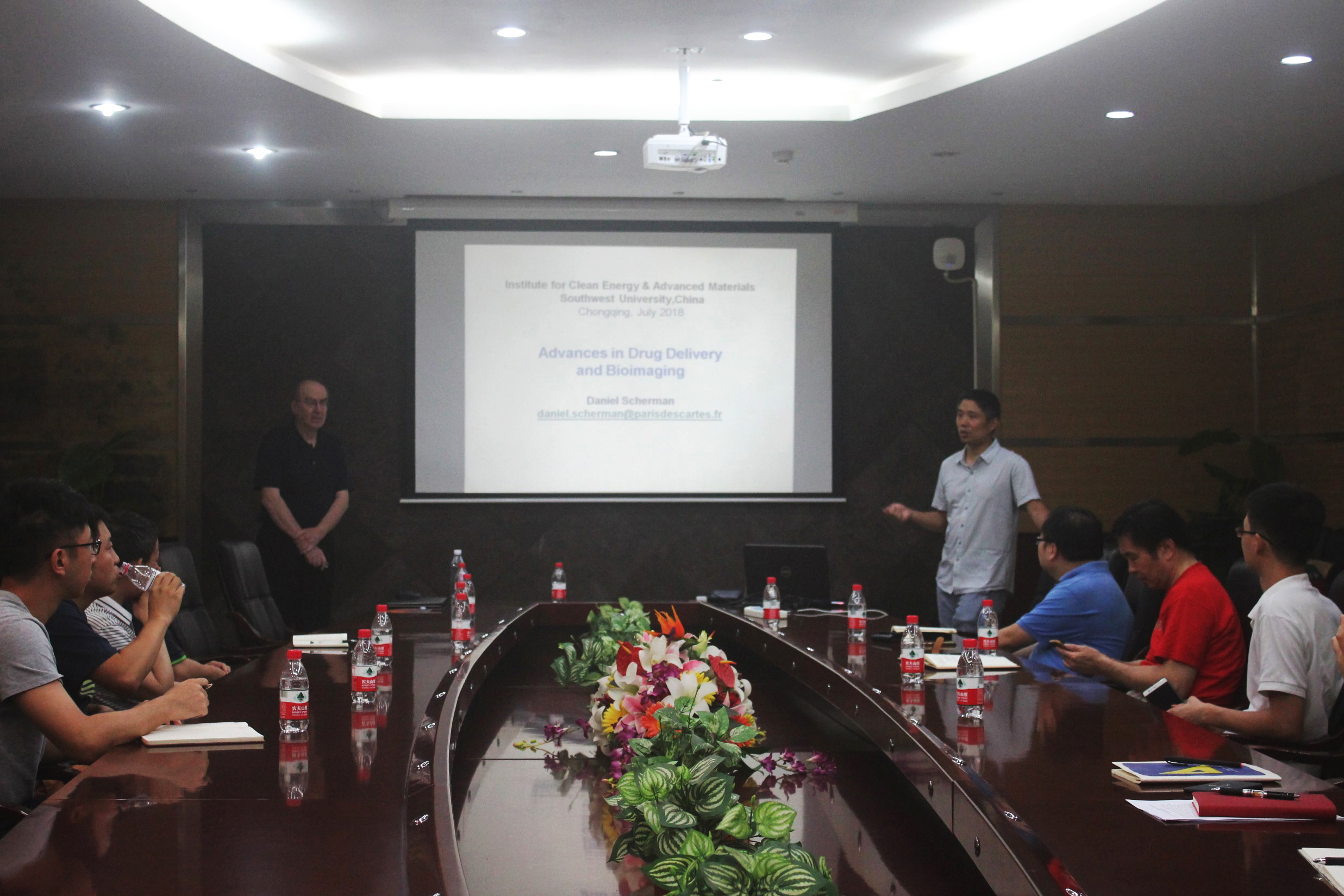 本次报告吸引了包括材料与能源学部、药学院、化学化工学院等多个科研单位40余名教师和研究生到场聆听和交流。本次报告中, Scherman教授首先介绍了课题组在药物输送、基因治疗等领域的相关工作。报告主要介绍了该课题组在药物输送体系的设计、构建、改进与优化、效果评价等方面的一系列尝试和探讨,既介绍了相关的相关领域的基础理论和设计思路,又结合细胞实验和动物实验对所研究体系进行分析和评价,为现场师生提供了一场前沿而充实的交叉学科学术报告。另外,Daniel Scherman教授介绍了其研究团队在长余辉纳米探针光学成像及其在生物学研究中的应用最新研究成果。深入浅出地介绍了长余辉纳米探针的理论基础、合成与功能化、光学性能调控等科学问题,同时介绍了该新型近红外长于辉发光纳米粒子在体内/体外生物成像,肿瘤靶向标记与诊断方面的应用。