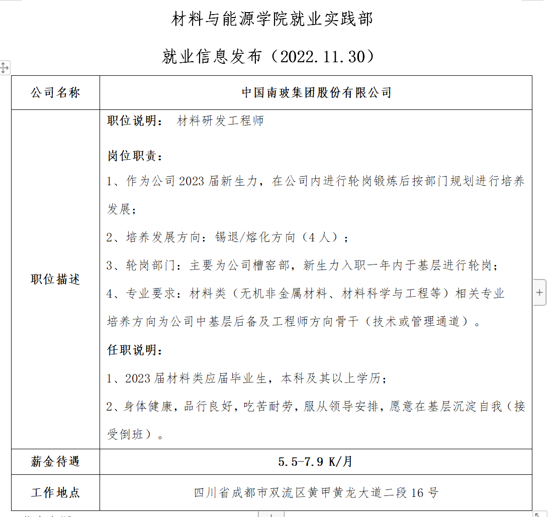 就业信息发布(2022.11.30)—中国南玻集团股份有限公司