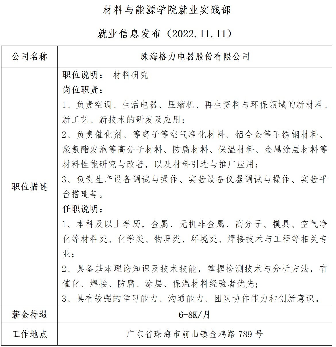 就业信息发布(2022.11.11)—珠海格力电器股份有限公司