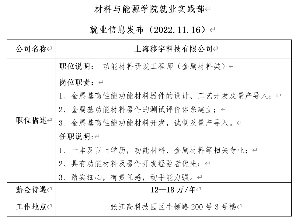 就业信息发布(2022.11.16)——上海移宇科技有限公司