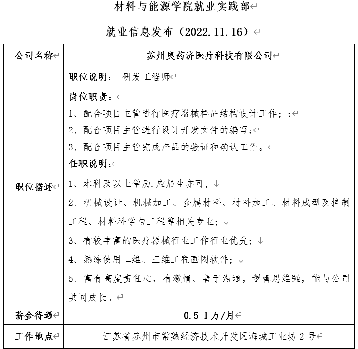 就业信息发布(2022.11.16)——苏州奥药济医疗科技有限公司