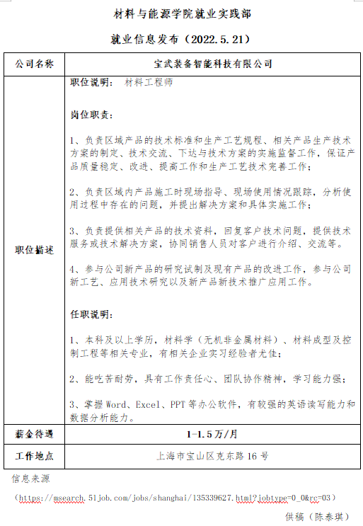 就业信息发布(2022.5.21)——宝武装备智能科技有限公司