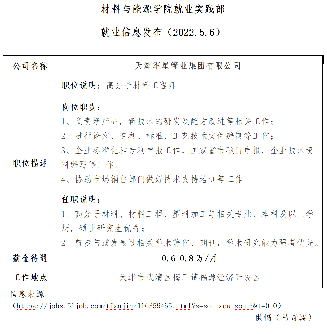 就业实践部 就业信息发布-天津军星管业集团有限公司(2022.5.6)