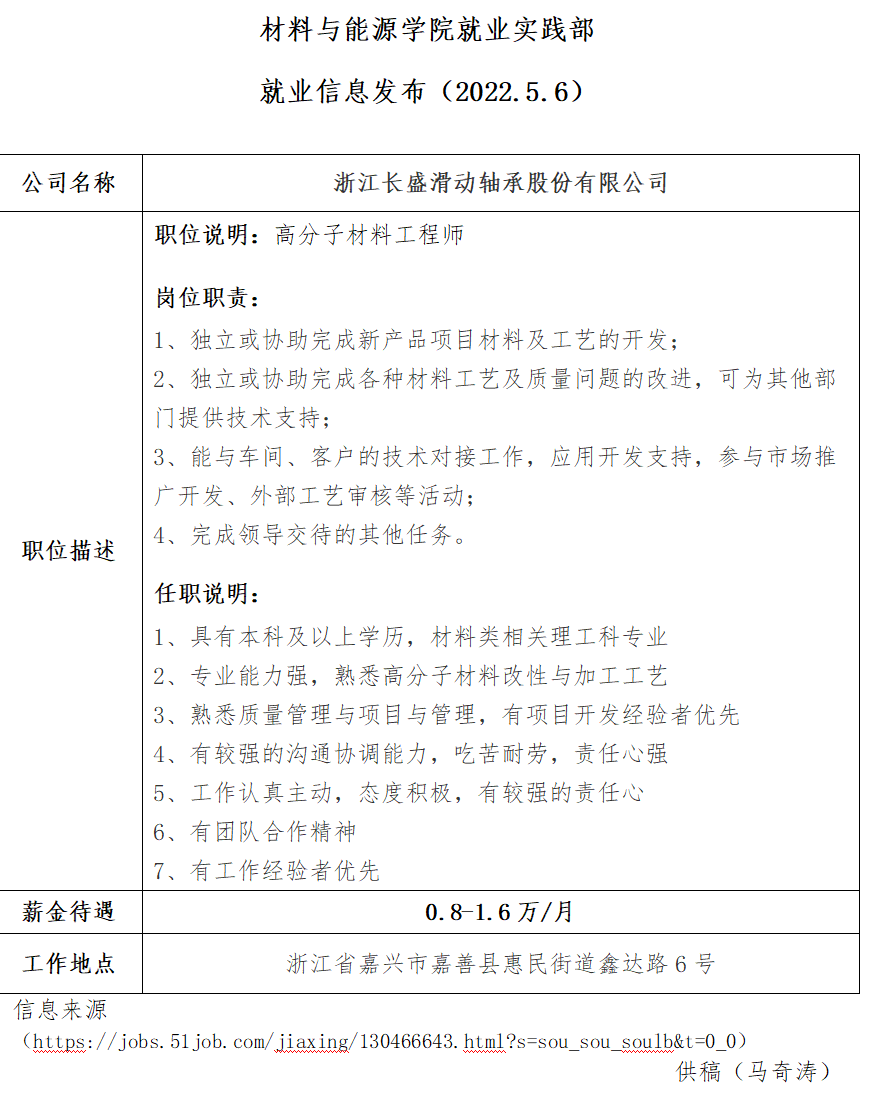 就业实践部 就业信息发布-浙江长盛滑动轴承股份有限公司(2022.5.6)