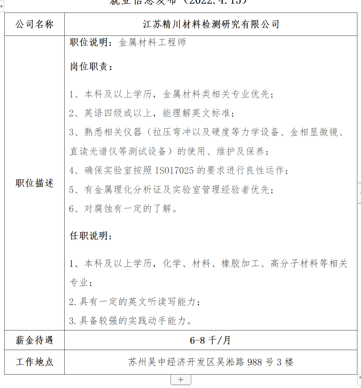 就业信息发布2022.4.15—江苏精川材料检测研究有限公司