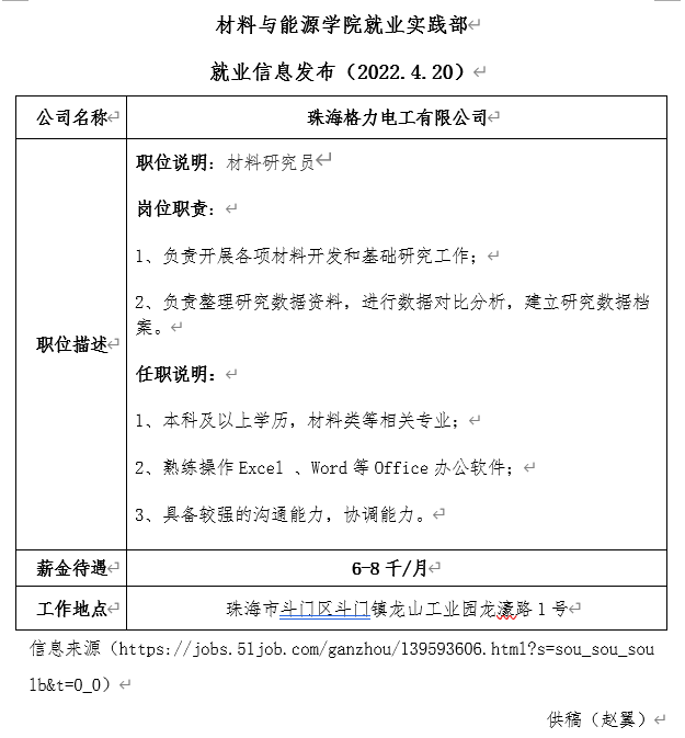 就业实践部发布(4.20)—珠海格力电工有限公司