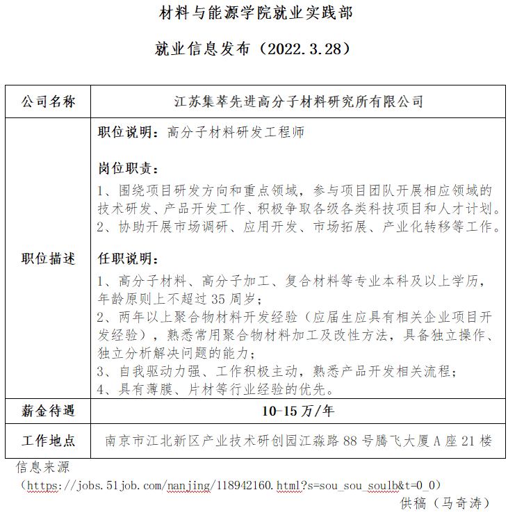 就业实践部发布(2022.3.28)—江苏集萃先进高分子材料研究所有限公司