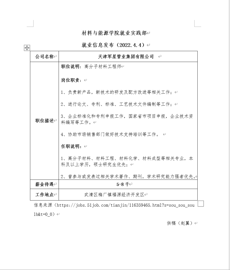 就业信息发布(2022.4.4)——天津军星管业集团有限公司