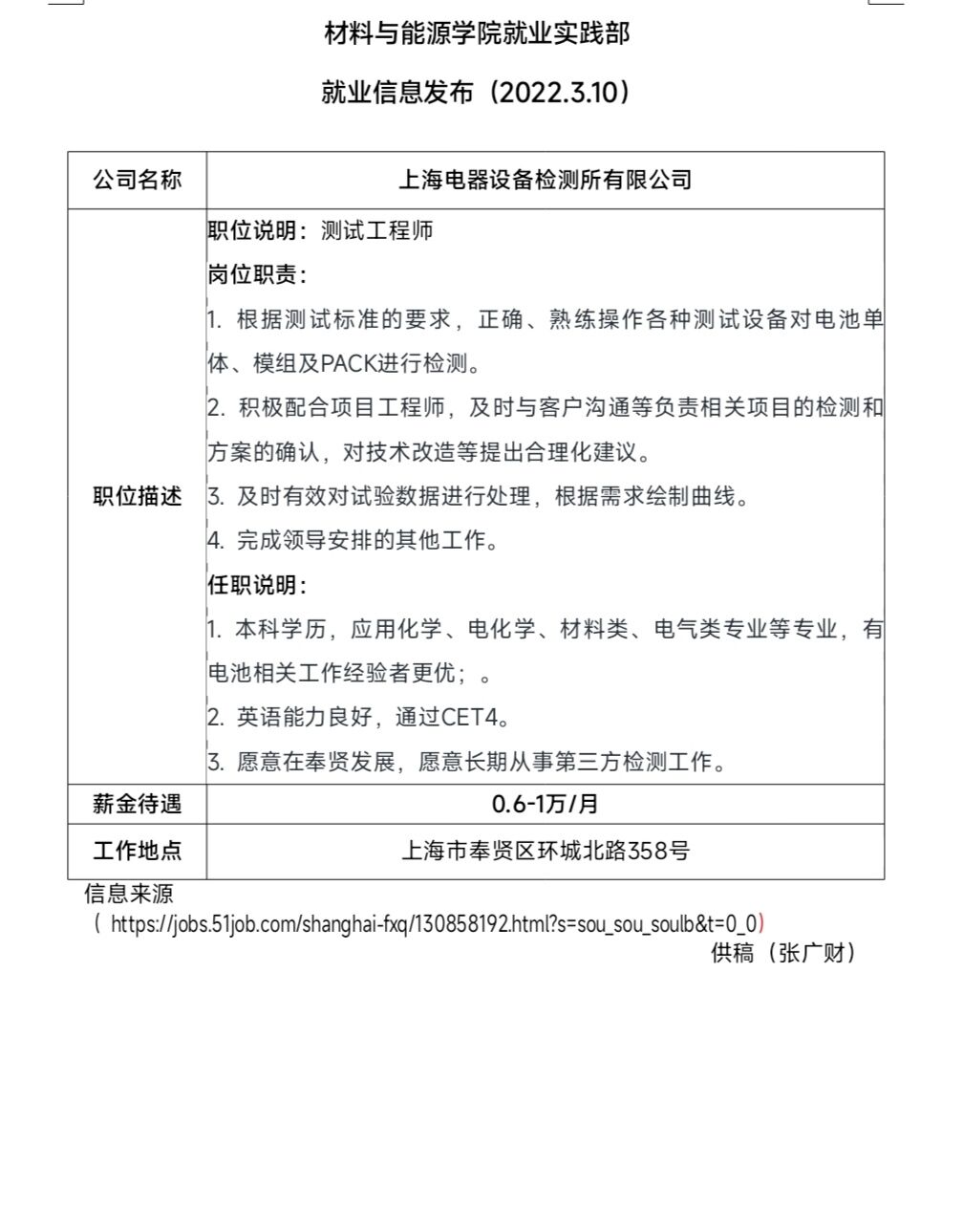 就业信息发布(2022.3.10)—上海电气设备检测所有限公司