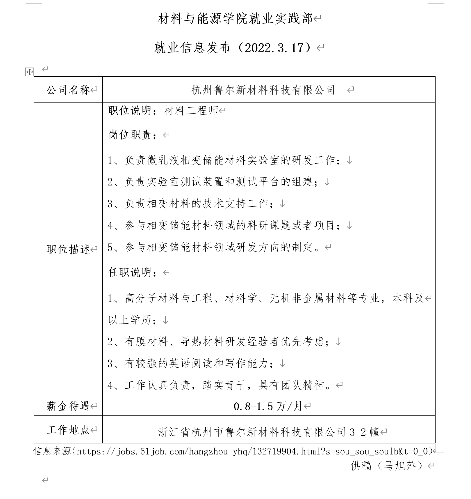 就业信息发布(2022.03.18)杭州鲁尔新材料科技有限公司