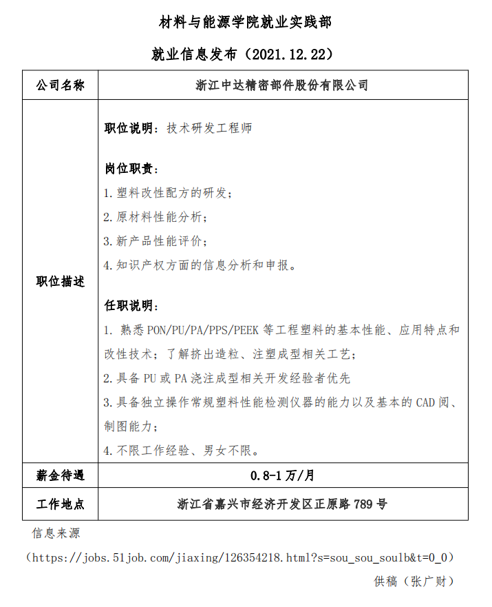 就业信息发布(2021.12.26)—浙江中达精密部件股份有限公司