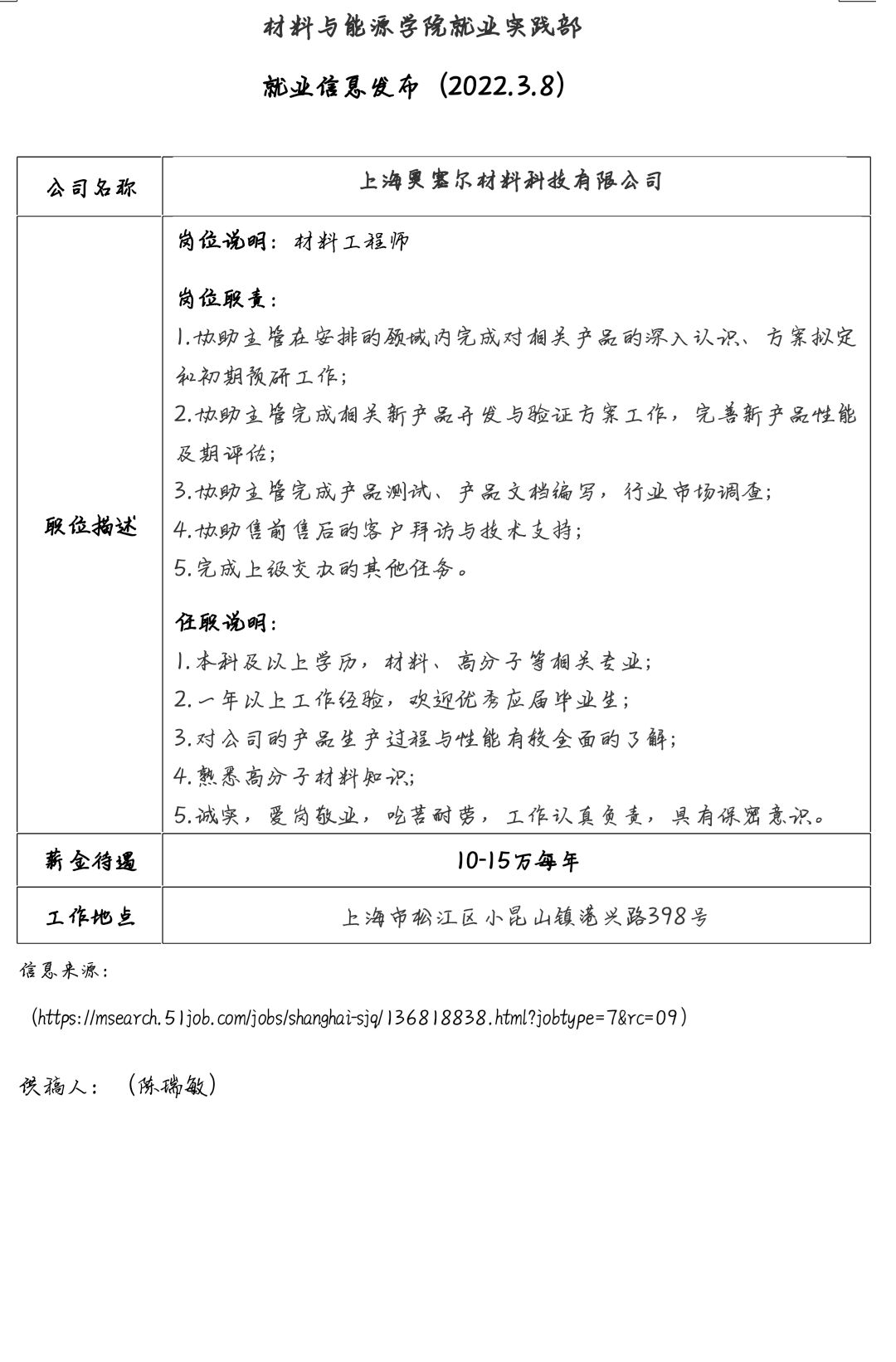 就业信息发布(2022.03.08)——上海奥塞尔材料科技有限公司