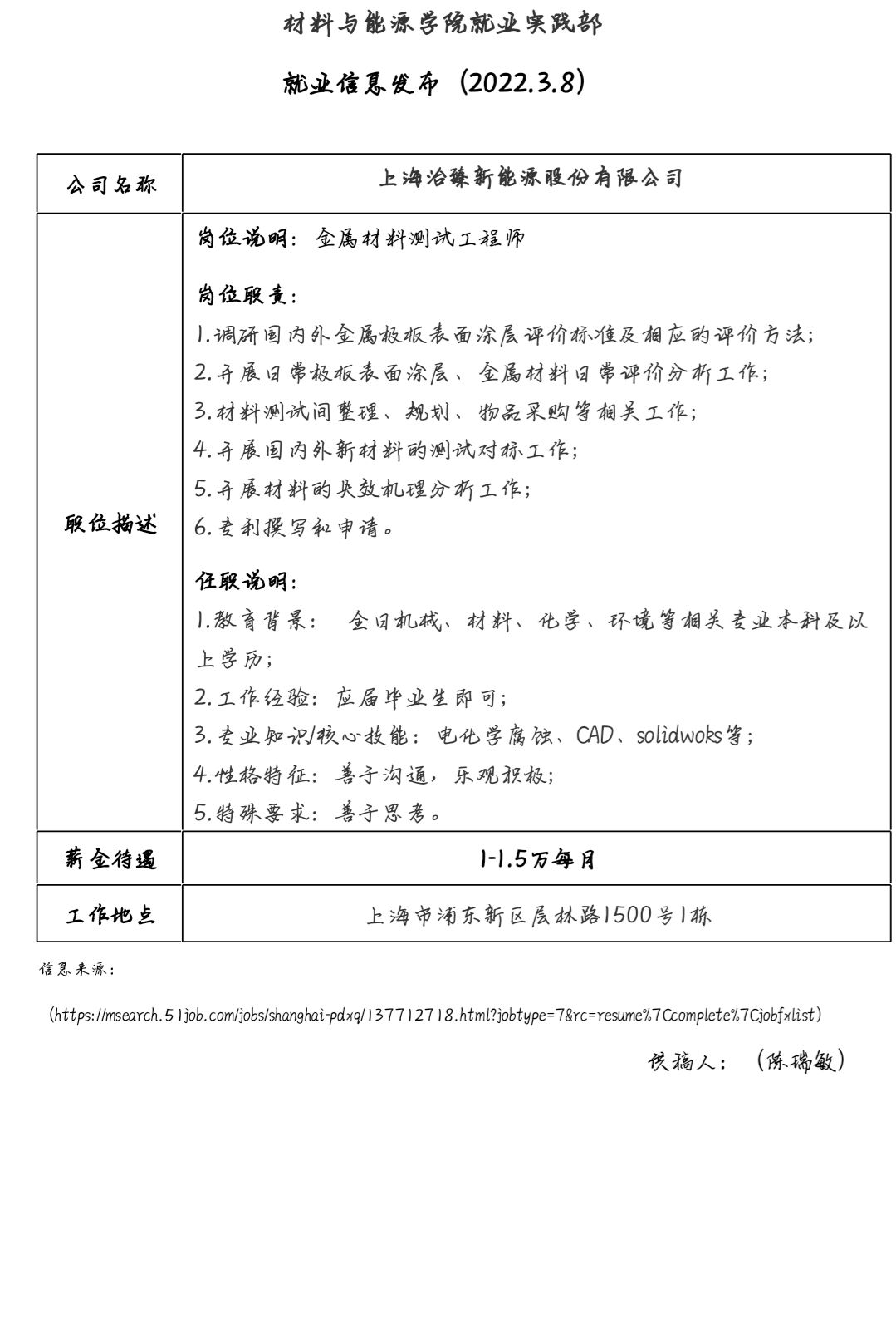 就业信息发布(2022.03.08)——上海治臻新能源股份有限公司