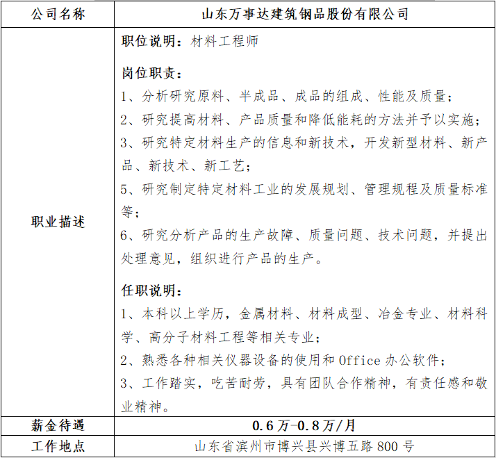 就业信息发布2021.11.24--山东万事达建筑钢品股份有限公司