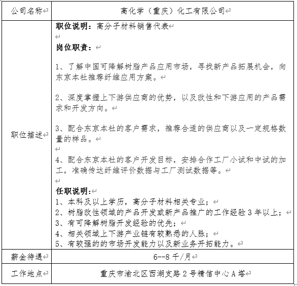 就业信息发布2021.5.26--高化学(重庆)化工有限公司