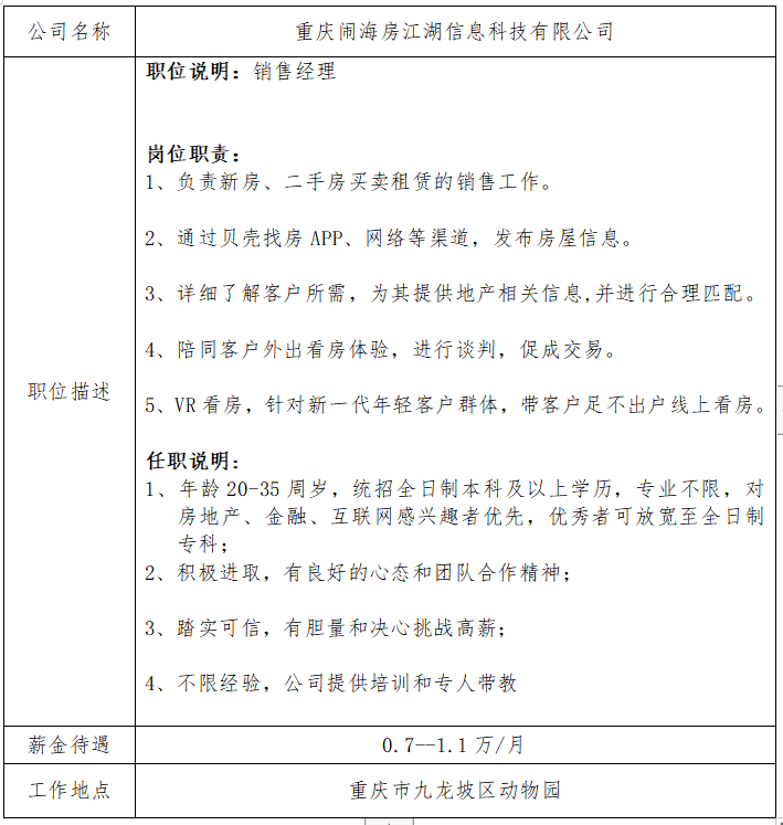 就业信息发布2021.5.4-重庆闹海房江湖信息科技有限公司