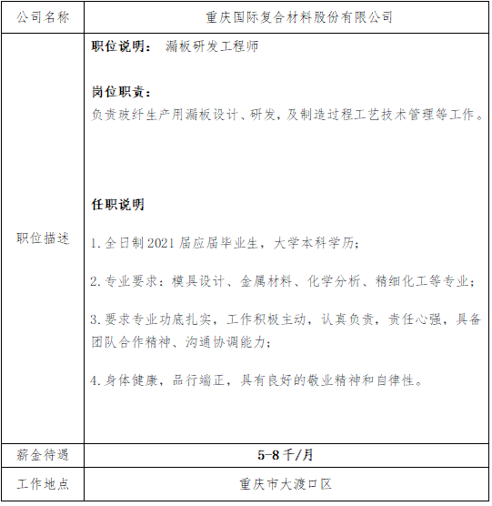 就业信息发布2021.3.27—重庆国际复合材料股份有限公司
