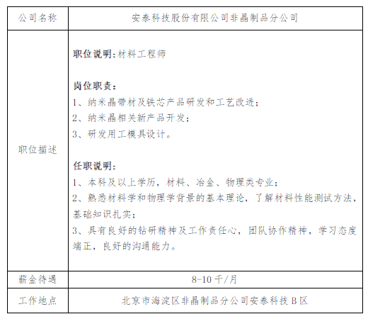 就业信息发布2021.4.1-安泰科技股份有限公司非晶制品分公司