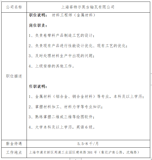 就业信息发布2021.3.12--上海菲特尔莫古轴瓦有限公司