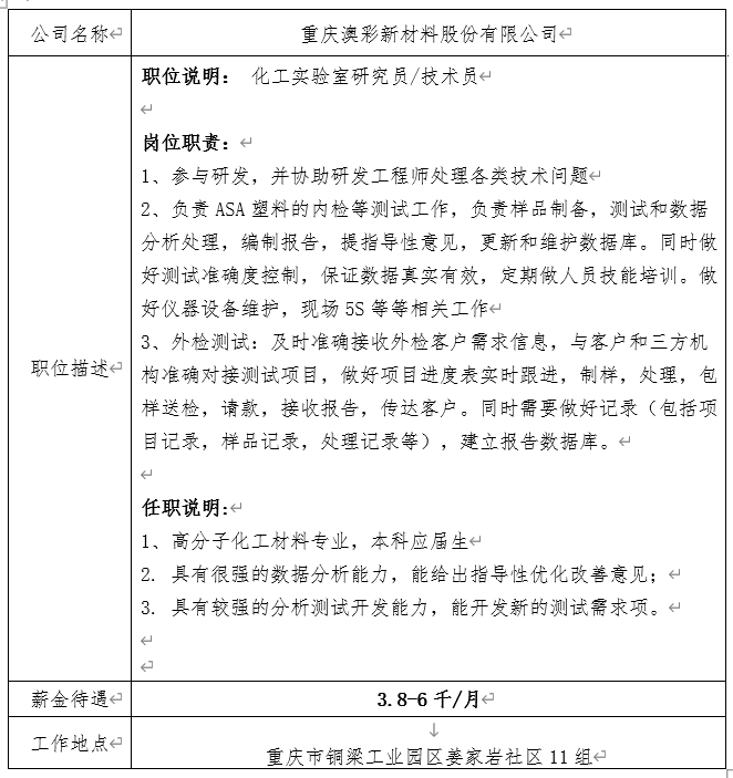 就业信息发布2021.1.18—(重庆澳彩新材料股份有限公司)