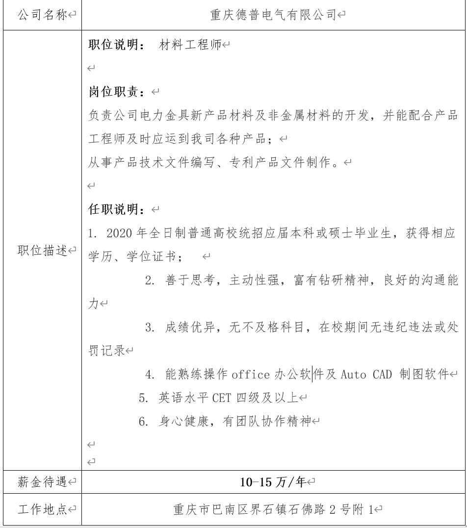 就业信息发布2020.11.27-重庆德普电气有限公司