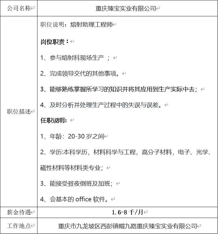 就业信息发布2020.10.30-重庆臻宝实业有限公司
