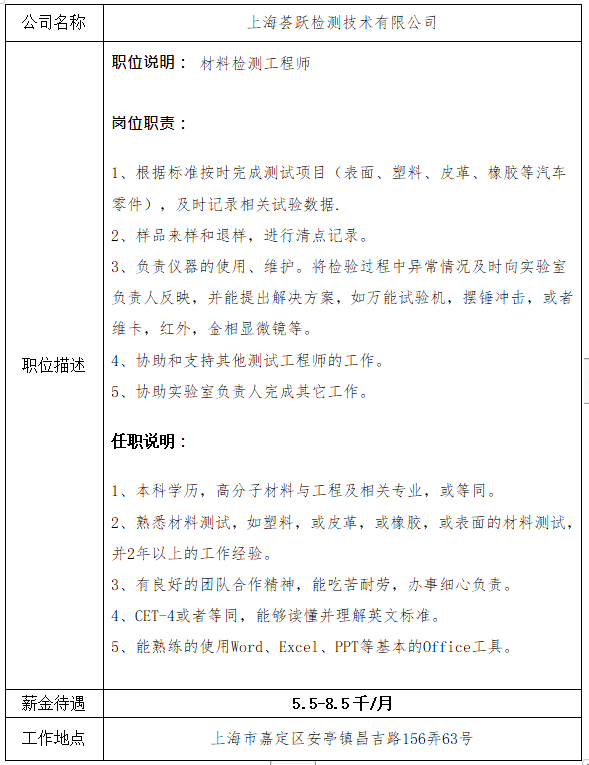 就业信息发布2020.11.10-上海荟跃检测技术有限公司