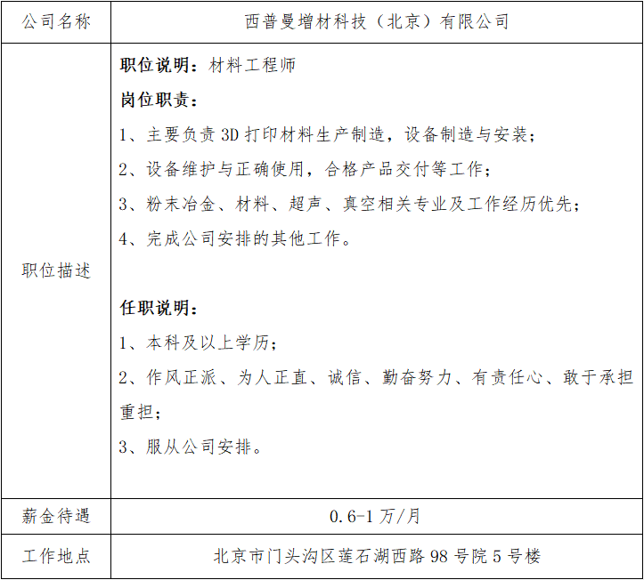就业信息发布2020.03.21-西普曼增材科技(北京)有限公司