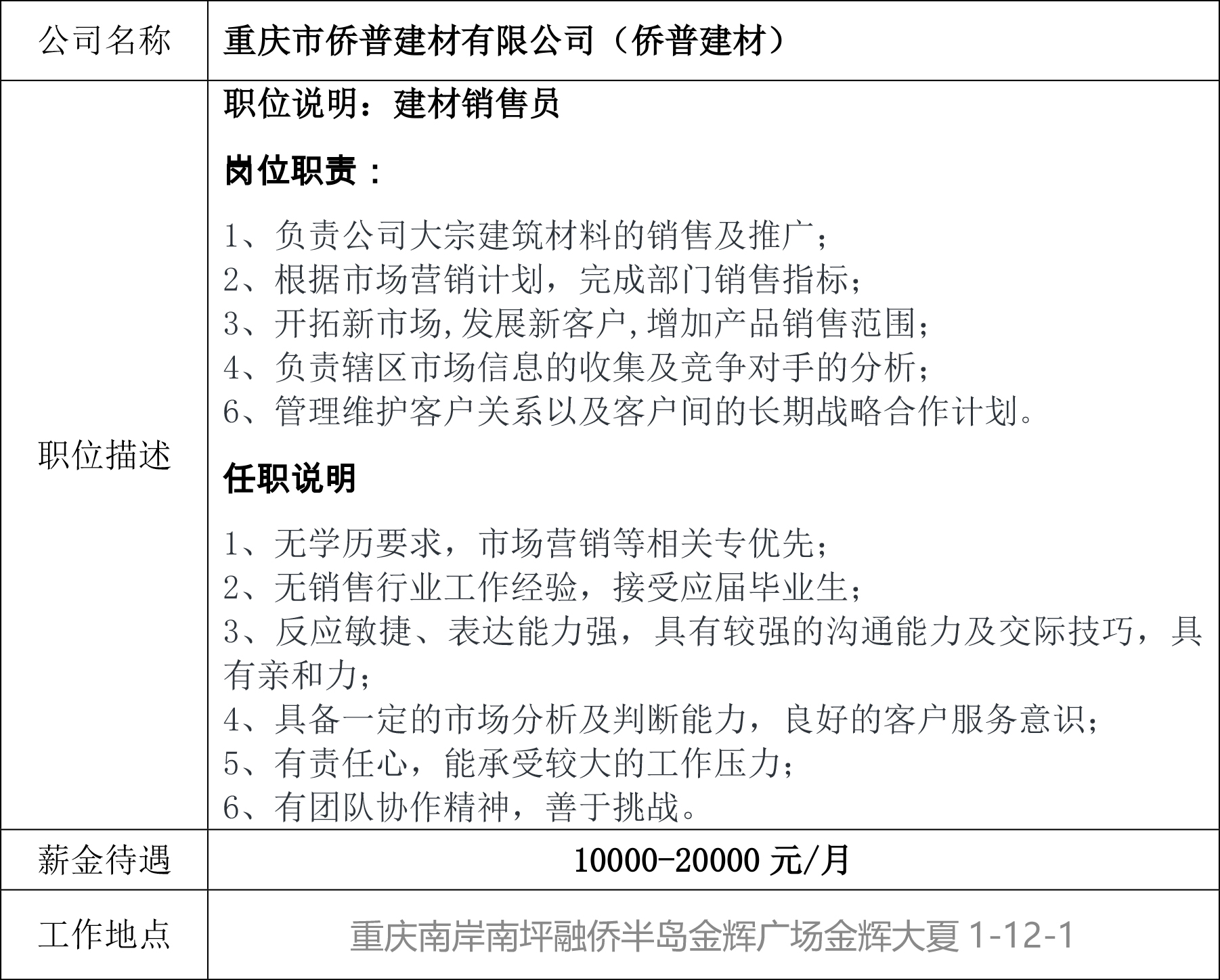 就业创业中心20181116发布-重庆市侨普建材有限公司(侨普建材)