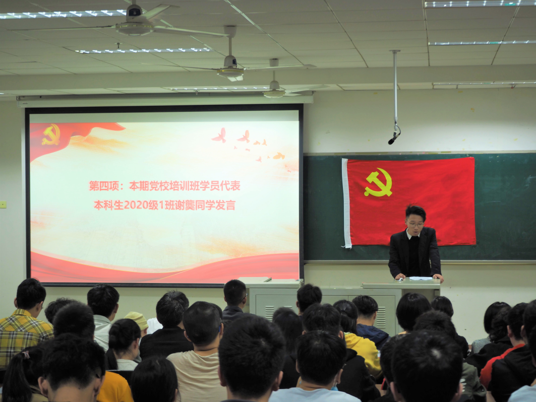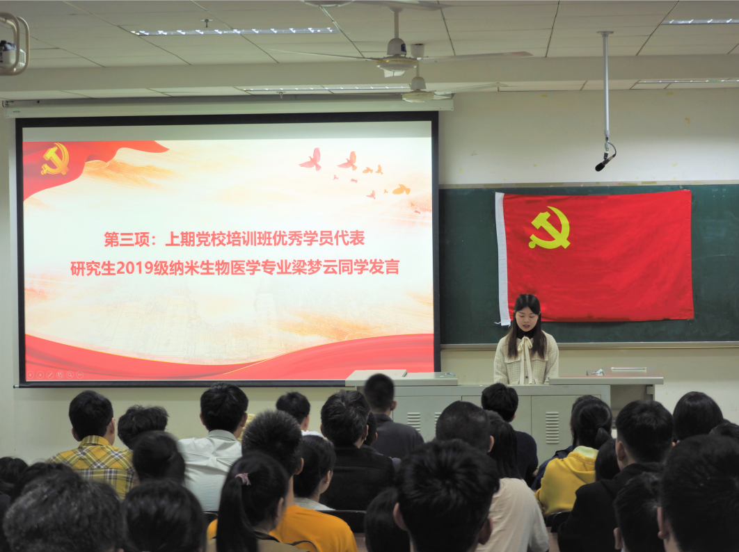 上期党校培训班研究生优秀学员代表梁梦云同学发言。她简要分享了自己在党校学习的收获,结合自身情况谈及了自己从一个普通员工转变为一个入党积极分子在思想和实际行动中的转变,呼吁同学们作为青年一代要肩负起时代赋予我们的使命和责任担当,努力学好专业知识,明确目标,把所学所获应用在实现社会主义现代化的伟大事业中,真正的把论文写在祖国的大地上,争做社会主义合格的接班人。