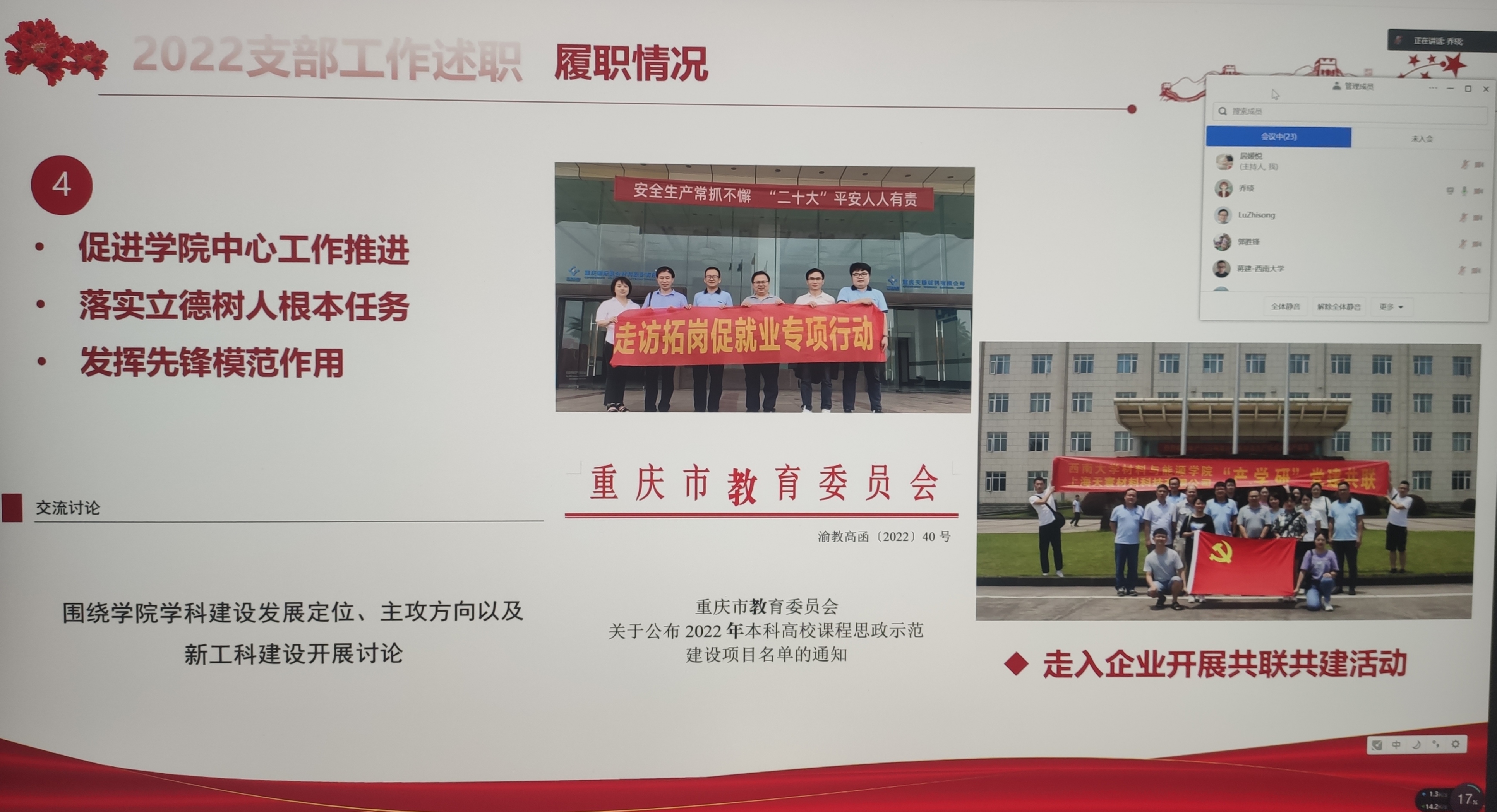 2022年12月29日公司党委2022年度党支部书记抓基层党建述职评议考核在线上召开。公司党委委员、纪委委员、专职组织员、各党支部书记、师生群众代表参加会议,公司党委书记李红同志主持会议。