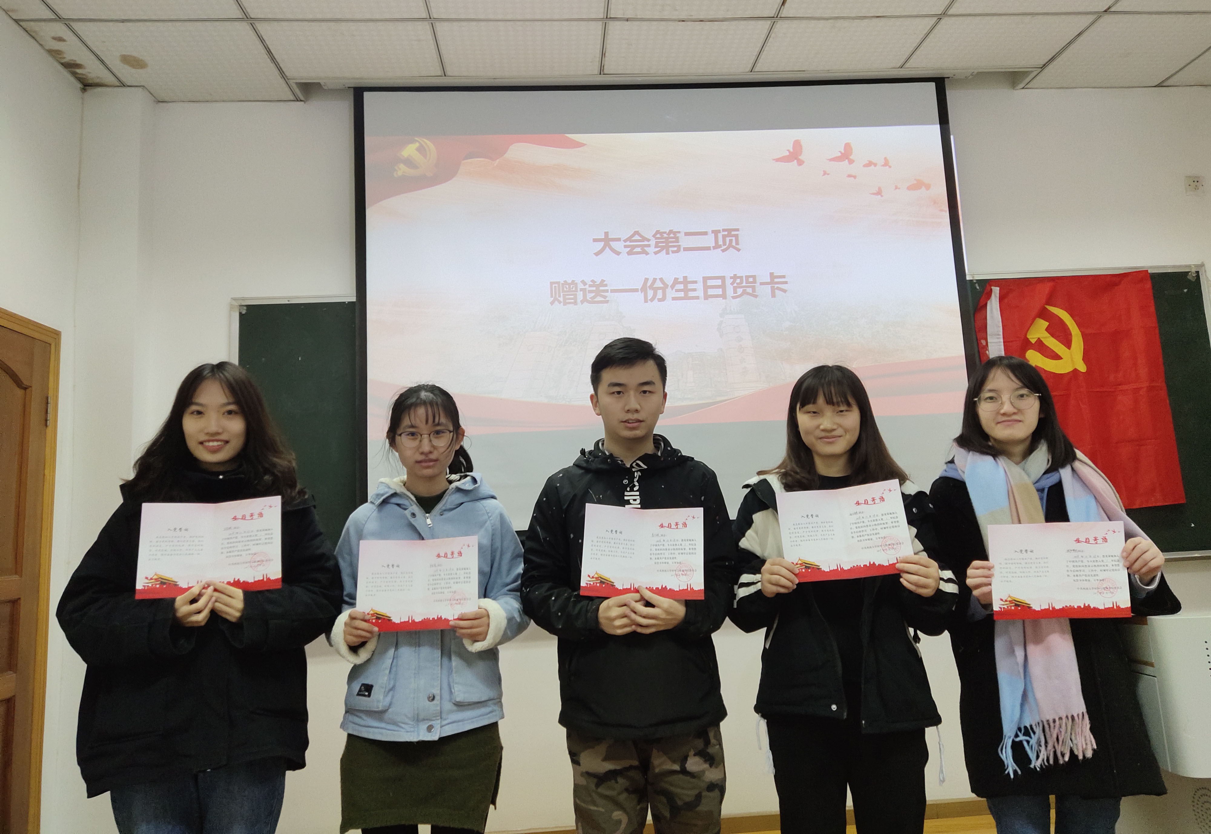 初心凝聚力量,使命催人奋进。为深入学习贯彻党的十九届四中全会精神,落实学校第三次党代会精神,深化“不忘初心,牢记使命”主题教育成效,加强党支部建设,不断增强党支部凝聚力和战斗力,进一步强化党员身份意识、责任意识、宗旨意识,切实发挥共产党员先锋模范作用,永葆共产党员先进本色,12月30日下午16点,本科生第一党支部在22教208会议室举行党员“政治生日”纪念活动。仪式由何焕生同志主持。