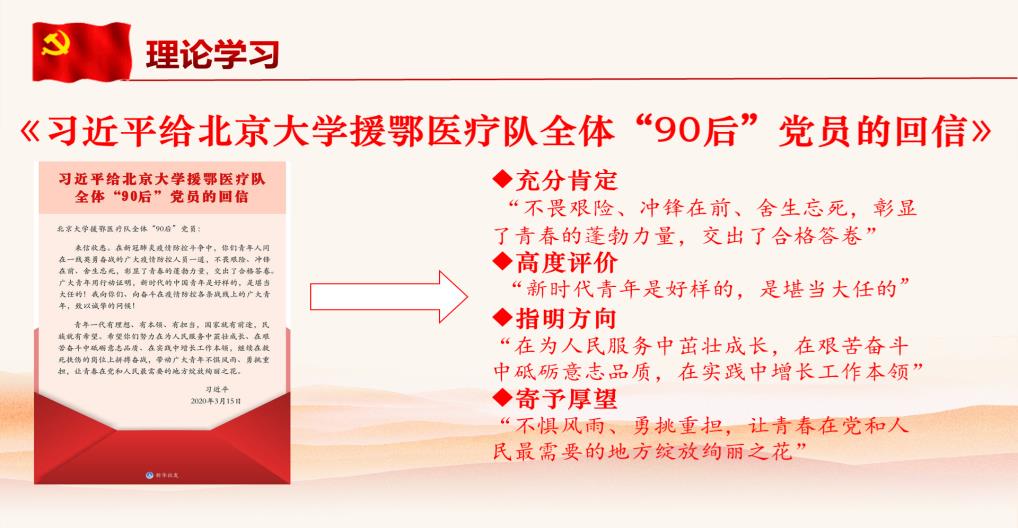 会议一致认为,习近平总书记在回信中对奋战在“疫”线广大青年的表现予以充分肯定,对新时代青年作出了高度评价,寄予了厚望,令人深受感动,备受鼓舞,青年员工要在为人民服务中茁壮成长,在艰苦奋斗中砥砺意志品质,在实践中增长工作本领,不惧风雨、勇挑重担,让青春在党和人民最需要的地方绽放绚丽之花。