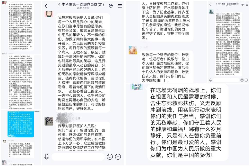 会议尾声,大家将提前准备的想对援鄂医护人员说的话一一进行分享。“你们和我们一样也是父母、儿女、妻子,但当你们义无反顾奔赴‘疫’区那一刻起,你们是何等的伟大”“是你们一往无前的冲上主战场,舍小家为大家,用专业的医术与病毒抢时间,用强大的责任心守护每一个病人的生命安全”“看到你们在防护服上写上对方的明晰相互鼓励时,看到你们进入隔离房前穿尿不湿以防止防护服浪费时间时,这种用生命守护生命的行为真的感染了我们所有人”“你们是这场战争最顽强的主力军,是我们所有人心中的真英雄,一句感谢无法言语出慢慢的情谊,只愿回来的你们永远平安顺遂”