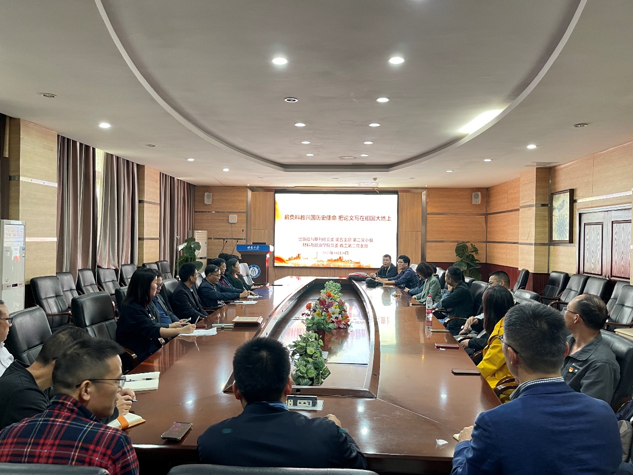 为深入学习贯彻党的二十大精神,坚定高校科研工作者科技报国理想信念,2023年10月20日下午,学院教师第二党支部联合出版社与期刊社第五党支部第二党小组开展“肩负科教兴国历史使命,把论文写在祖国的大地上”主题党日活动。公司党委书记梁武、副经理郭胜锋、教师第二党支部党员,出版社与期刊社党委第五党支部书记、期刊社社长张陈及第五党支部第二党小组党员共20余人参加活动,活动由教师第二党支部书记郭宁主持。