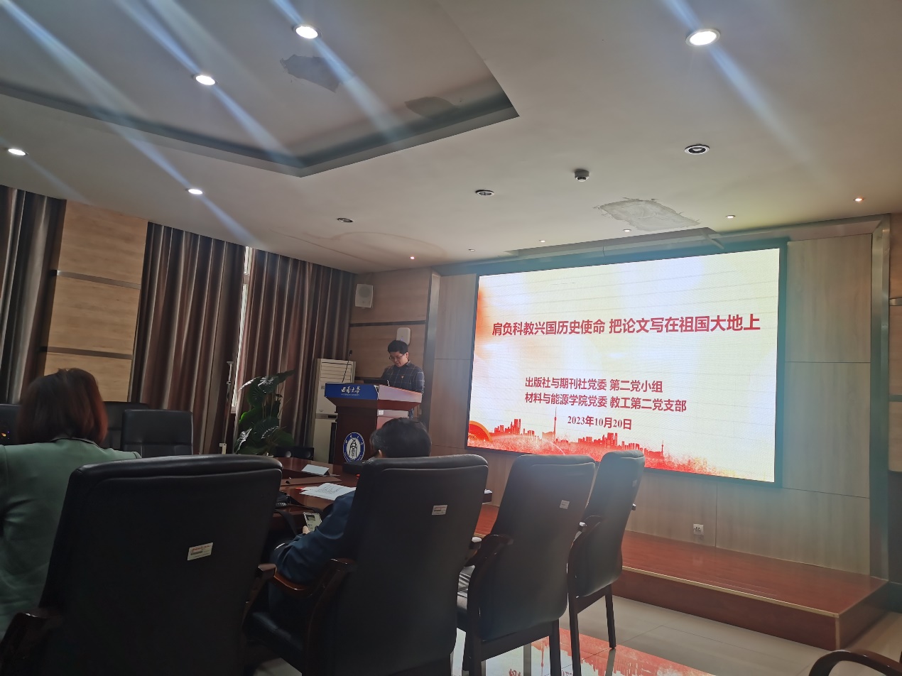 随后教师第二党支部王放同志分享了为高水平期刊审稿经验,刘婷婷同志讲解了国内高水平期刊《Journal of Magnesium Alloys》(以下简称JMA)的办刊历程,分享了担任JMA青年编委的经历。出版社与期刊社第五党支部第二党小组包颖同志介绍了《必一运动学报(自然科学版)》(以下简称西大学报)的办刊历程,张陈讲解了西大学报发展现状及发展方向。