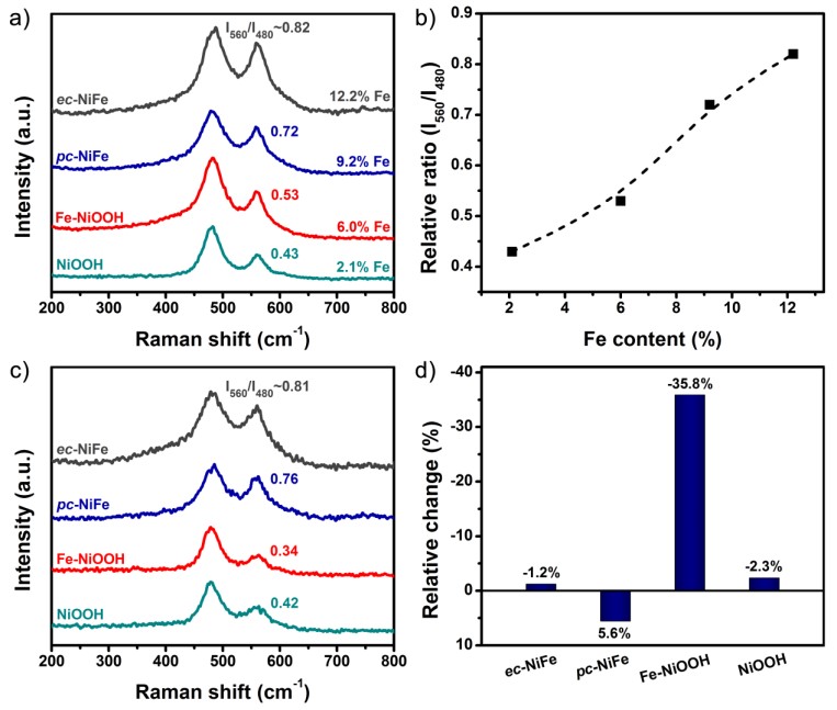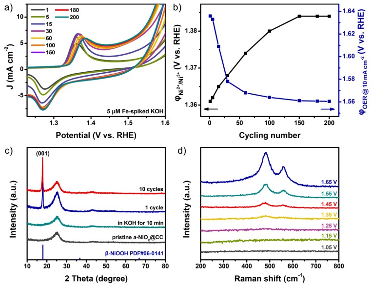 图2. Fe-NiOOH@CC制备过程中相变化的电化学、拉曼解析。