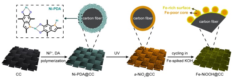 图1. Fe-NiOOH@CC催化剂的合成示意图