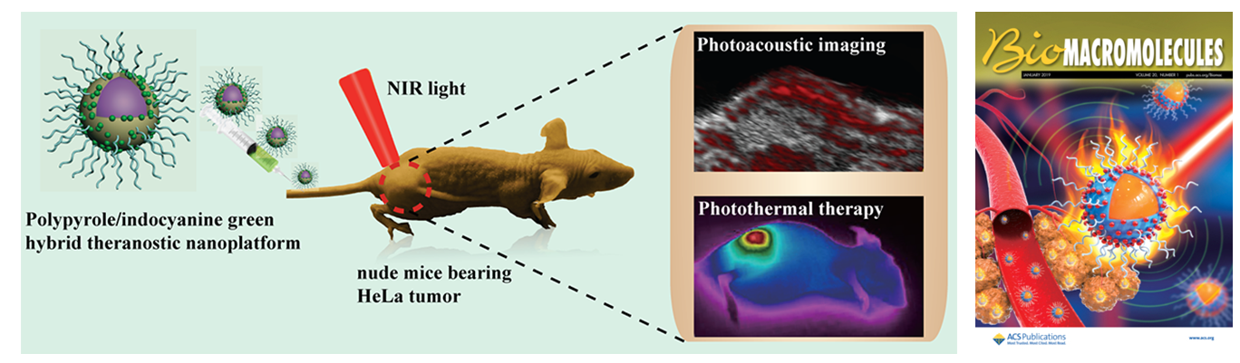 近日,公司刘辉副教授课题组将两种光热剂相结合,设计制备了具有良好肿瘤诊断和治疗性能的纳米诊疗剂。相关研究成果以Enhanced Photoacoustic and Photothermal E ect of Functionalized Polypyrrole Nanoparticles for Near-Infrared Theranostic Treatment of Tumor为题发表在国际知名期刊《Biomacromolecules》上,并被选为封面论文,该期刊为高分子科学一区论文,2017年影响因子为5.738。必一运动为该成果的第一完成单位,李文超(2016级硕士)为该论文的第一作者,刘辉副教授为最后通讯作者。重庆医科大学曹阳副教授和汪星月分别为该论文的并列通讯作者和并列第一作者。