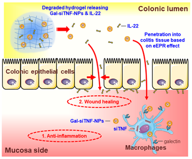 UC是一种现代难治病,传统治疗仅仅围绕如何降低炎症,远不能满足临床治疗需求。理想的UC治疗策略不仅要缓解炎症,还要促进受损黏膜修复。肖波教授课题组制备了一种半乳糖表面修饰载TNF-α siRNAsiTNF)纳米粒子,然后利用水凝胶包裹该具有抑炎功能的纳米药物和具有黏膜修复功能的IL-22,最后口服共载siTNF/IL-22水凝胶对UC展开协同治疗。研究证明该共载水凝胶可在炎症结肠部位有效崩解,进而释放所包裹的纳米药物和IL-22,最终同时实现缓解炎症和修复受损黏膜。