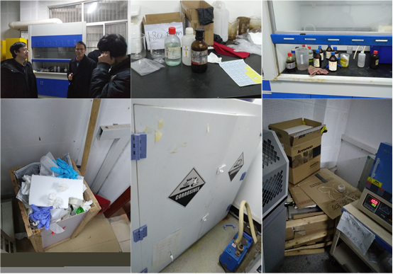 检查从86、89教本科教学实验室开始,由于学校隔断缙云美食城,86、89教进出道路被堵,目前只能从档案馆后方一条小道进出。该条小道比较陡峭,而且路况较差,请学部全体师生进出时务必格外小心。86、89教经过暑期整改后,已经面貌一新,但是仍然存在部分化学药品乱摆放情况。安全工作小组随后来到25教进行检查,检查过程发现25教部分实验室摆放较多易燃物,设备拆箱后的纸箱木架未及时丢弃。最后,实验室安全工作小组来到21教科研实验室进行检查。21教存在的安全隐患包括:部分员工未穿实验服、实验桌面地面不整洁、实验垃圾堆积太久、双锁药品柜未锁、通风橱内脏乱等情况。安全工作小组在现场对实验室安全隐患提出了整改措施,要求相关责任人高度重视,尽快完成隐患问题整改,以营造和谐安全的实验环境。