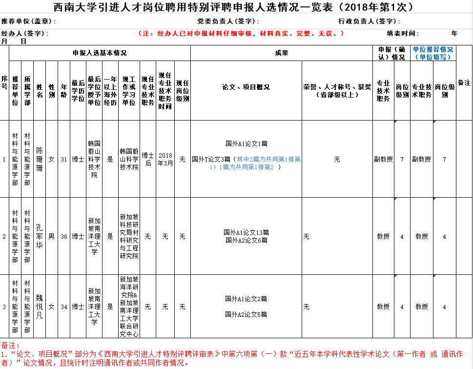 根据学校《关于印发< 必一运动引进人才特别评聘办法>的通知》(西校〔2013〕88号)文件和《关于启动2018年第1次引进人才特别评聘工作的通知》要求,经本人申请,学部党委对申报人选的政治立场、师德师风进行了审查,学部学术委员会及岗位设置与聘用工作组对申请者的专业技术职务、聘任岗位进行初评,现将学部2018年第1次特别评聘的初评结果进行公示如下,公示期三天,从2018年4月21日-4月23日,如有异议,请实名反馈,受理电话:68367036。