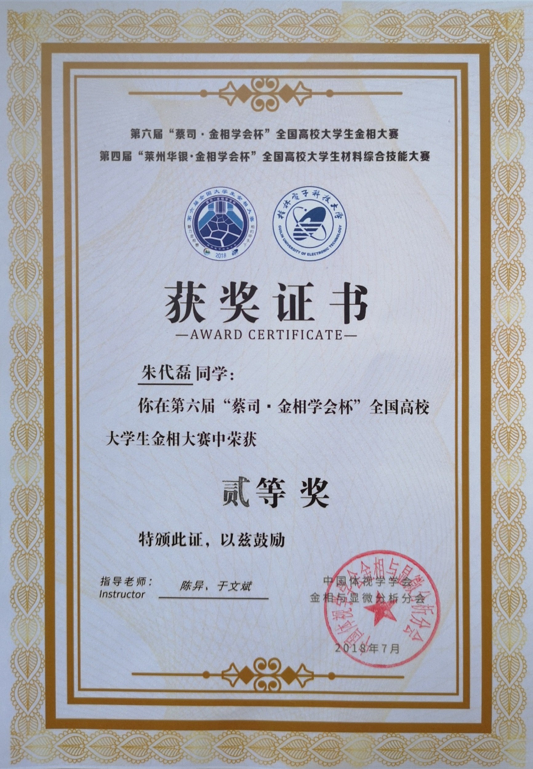 朱代磊同学获得金相大赛...