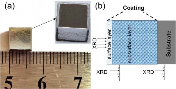 图1 表面涂层处理后铁铬铝ODS钢实物图(a)和XRD检测位置示意图(b)