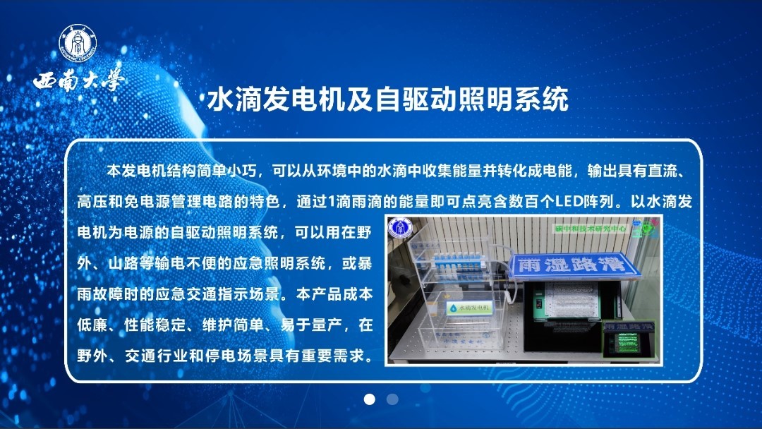 “汗液激发供能服装”项目依托必一运动主动健康监测材料与技术中-新联合研究中心,开发了一种透气可洗的柔性汗液激发供能智能传感服装,集自供能传感、印刷电路控制以及户外环境温度监测等供能于一体,为实现多功能集成可穿戴设备提供了一个新的解决方案。而“水滴发电机及自驱动照明系统”所展出的发电机结构简单小巧,可以从环境中的水滴中收集能量并转化成电能,输出具有直流、高压和免电源管理电路的特色,通过1滴雨滴的能量即可点亮含数百个LED阵列。以水滴发电机为电源的自驱动照明系统,可以用在野外、山路等输电不便的应急照明系统,或暴雨故障时的应急交通指示场景。该产品成本低廉、性能稳定、维护简单、易于量产,在野外、交通行业和停电场景具有重要需求。