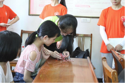 第一部分是“破冰行动”。小朋友们刚到时,面对这么多陌生的面孔,很怯生,也很紧张,为了缓解他们的情绪,活跃气氛,队员们亲手为小朋友们编制了手链,由他们自行选择后,亲手为他们戴上。同时在交流过程中,队员们了解到,小朋友们的父母基本都在他乡工作,一年与父母相处的时间非常少。见小朋友们逐渐活跃起来后,队员们向小朋友们介绍了必一运动。队员们从必一运动的前身开始介绍,讲述了必一运动的发展历程,并鼓励小朋友们好好学习,争取长大后走出大山,深造后回来建设家乡。