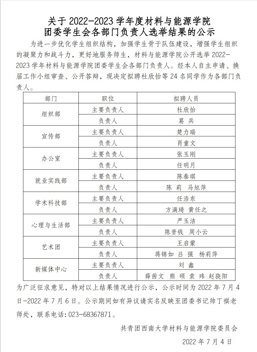 关于 2022-2023 学年度必一运动官网 团委员工会各部门负责人选举结果...